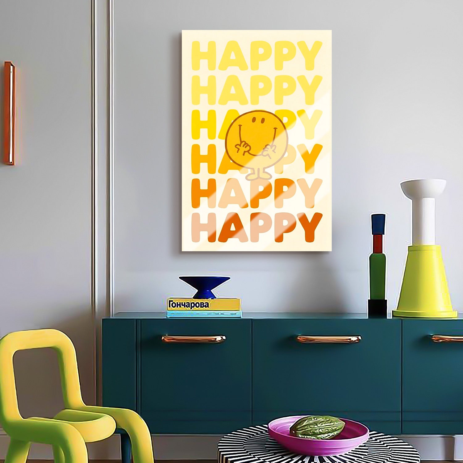 Mutluluğun en sade hali, tekrar eden bir ritimle vurgulanıyor. “HAPPY”, güçlü tipografisi ve sıcak renk geçişleriyle pozitif bir enerji yayar. Tekrarlayan yazı yapısı mesajı güçlendirirken, ortadaki karakter tasarıma eğlenceli ve samimi bir dokunuş katar. Minimal ama etkili yapısıyla bulunduğu ortama neşe ve canlılık getirir.